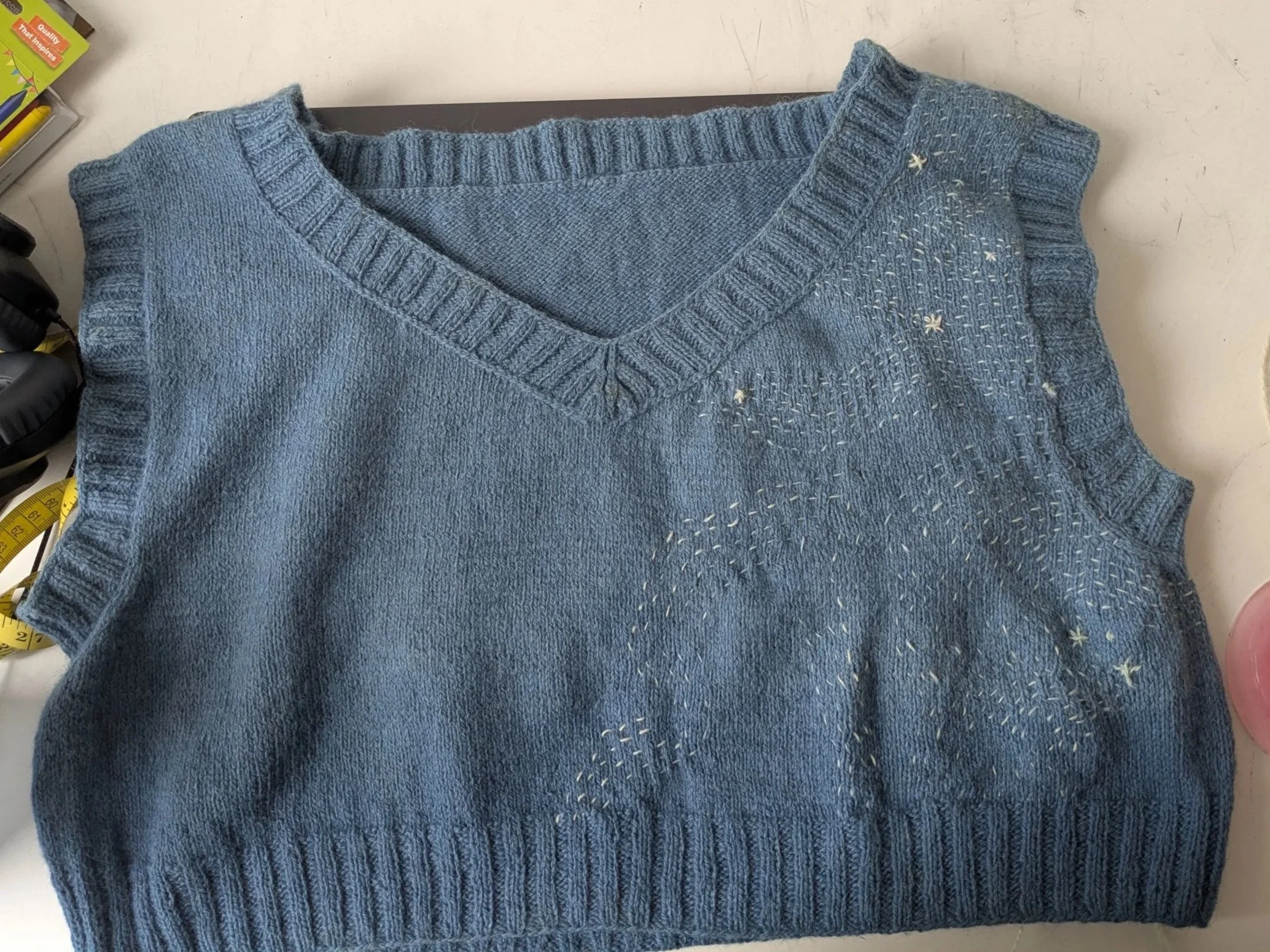 Once the vest had dried, I returned to it with embroidery. Using the same yarn, I stitched manta rays swimming diagonally across the surface. Drawing inspiration from Sashiko, I added textured, wave-like stitches to suggest water in motion. These details brought the piece to life in a way that felt restrained but intentional.